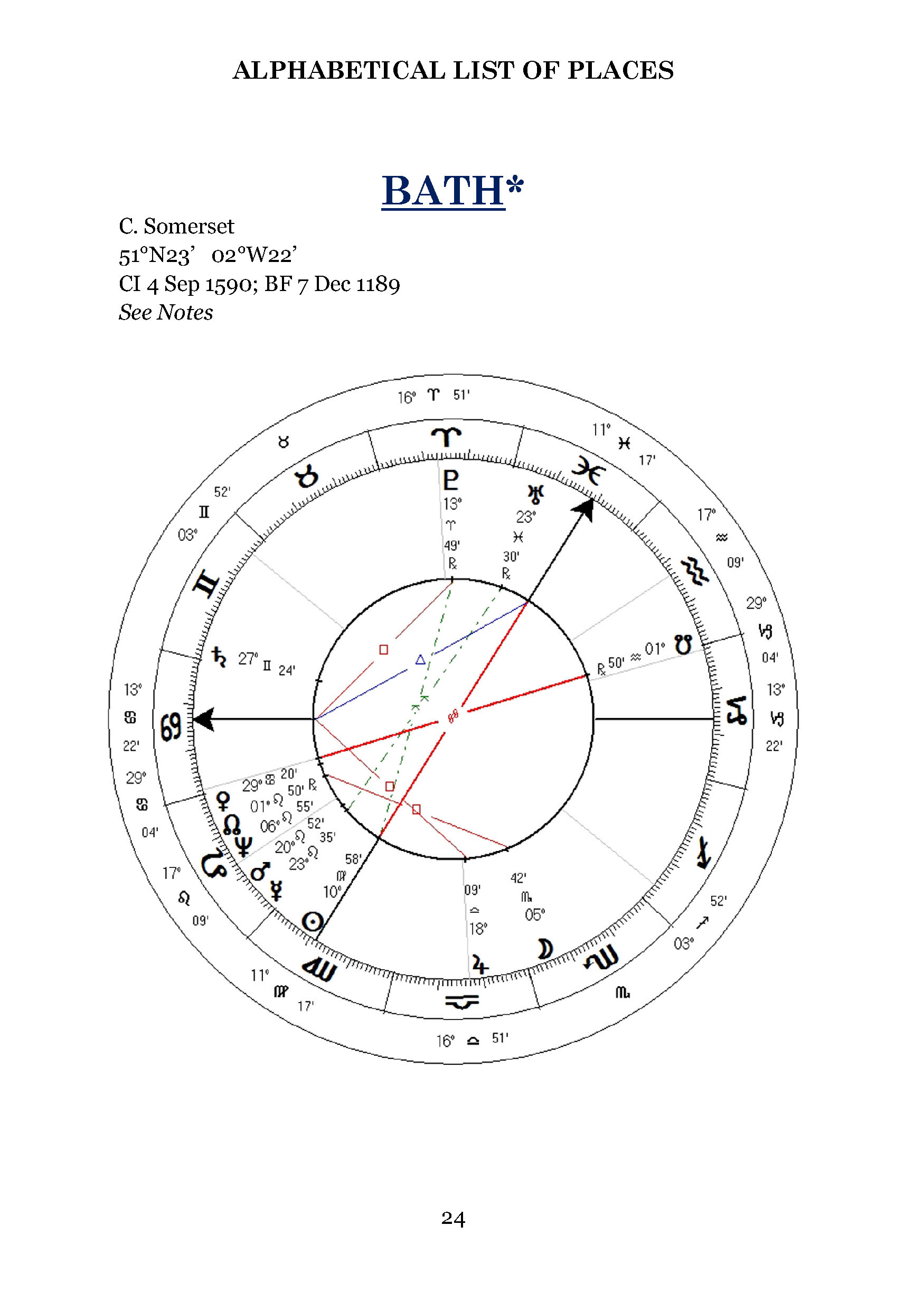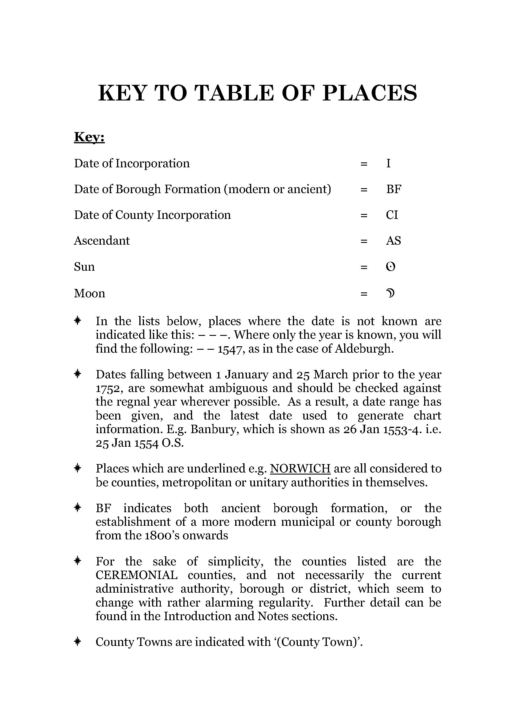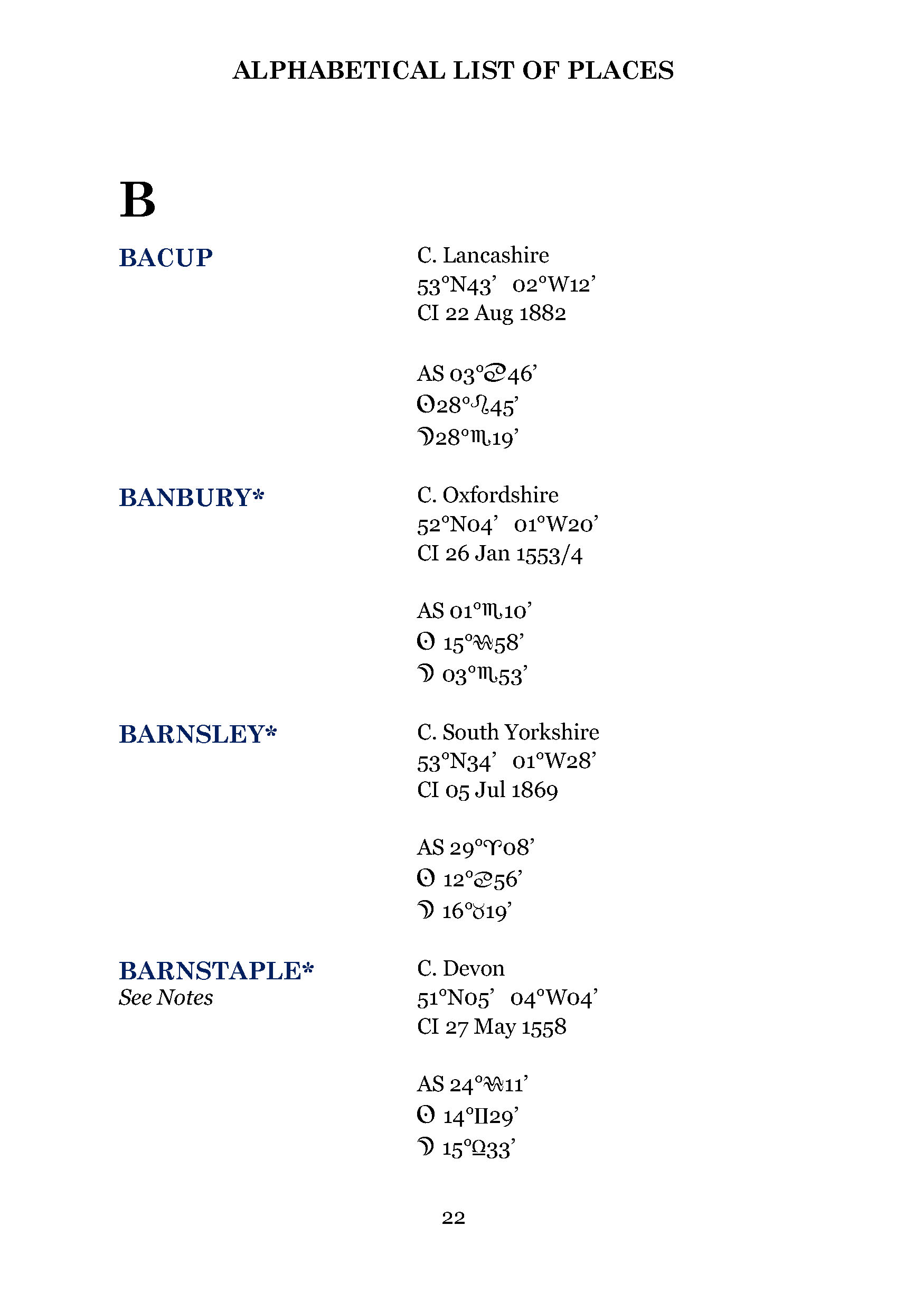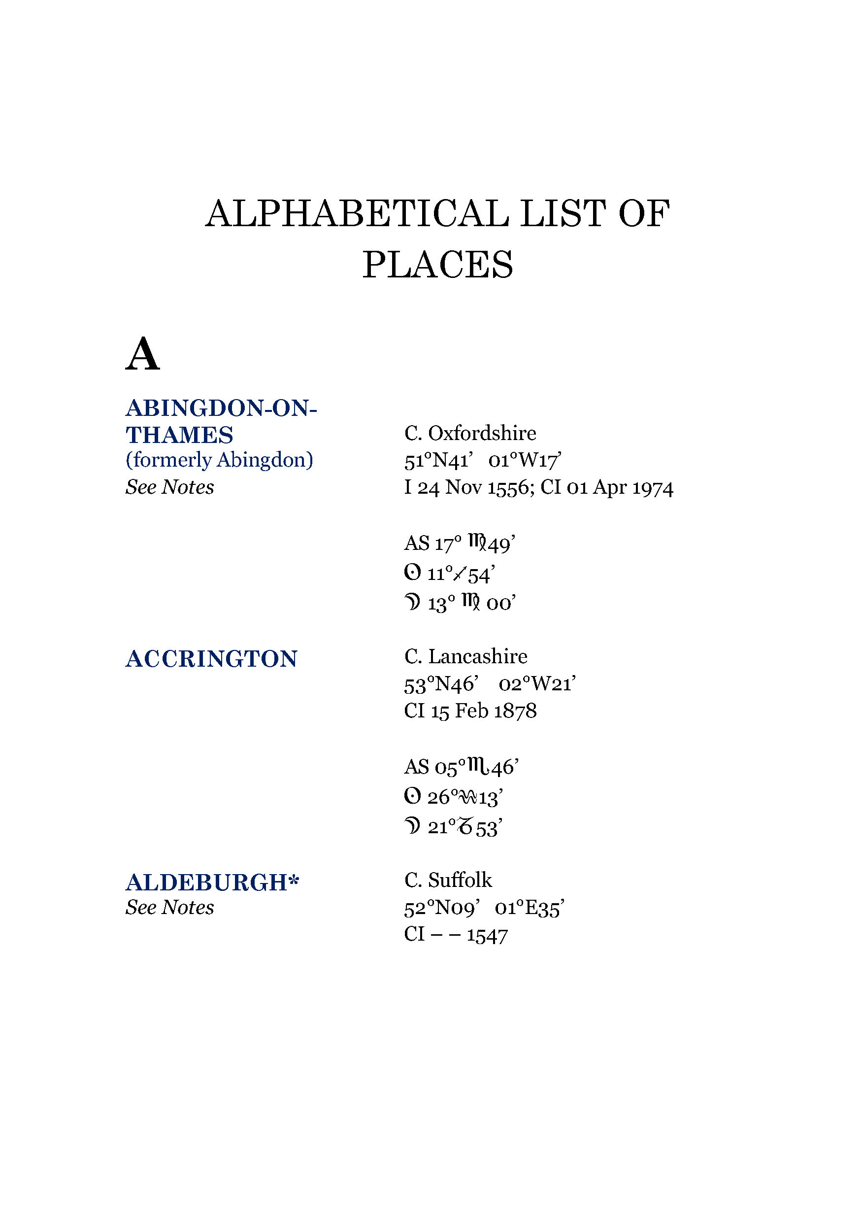 Each listing contains the key data needed by any astrologer to construct a chart for the town or city in question, including incorporation dates, geographic co-ordinates, the latest county classifications and main chart indicators (AS, Sun and Moon).